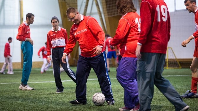 Hetente egyszer 30-35 fogyatékkal élő felnőtt rúgja a labdát a Vidi-stadion melletti csarnokban.