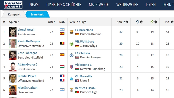 A világ legjobb futballistáit is felsorakoztató listán a 19 gólpasszos Lionel Messi az első, őt követi a Wolfsburg játékosa, Kevin de Bruyne, majd Cesc Fabregas következik 17-tel, utánuk jön klubunk büszkesége, Gyurcsó Ádám, aki 15 gólpasszal áll idén lejátszott 23 bajnokiján.