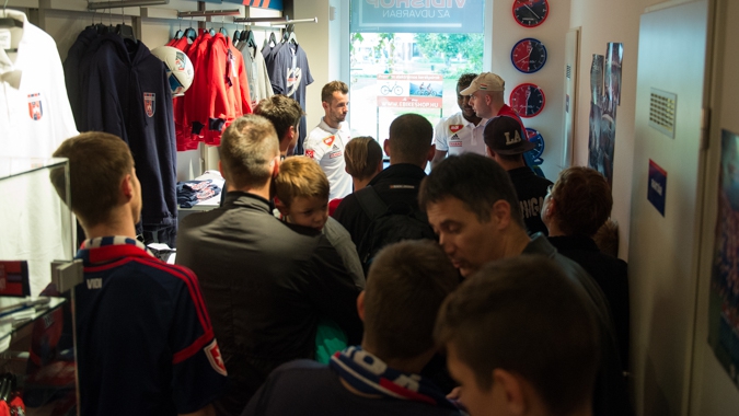 Bosnyák-magyar szélsőnk és nyáron igazolt támadónk fáradhatatlanul írták alá az autogramkártyákat és más vidis relikviákat, köztük a helyben 15% kedvezménnyel megvásárolt mezeket, valamint fotózkodtak is a rajongókkal.