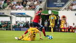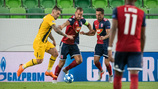 A találkozó első helyzetéből gólt szerzett az AEK Athén a 35. percben. Bakasetas 15 méteres átlövését Kovácsik bravúrral védte, a labda azonban az üresen érkező Klonaridis elé pattant, aki közvetlen közelről a kapunkba lőtt (0-1). A mieink emberhátrányban sem adták fel, és a 39. percben nagyon közel jártunk az egyenlítéshez. Kovács bal szélről érkező hajszálpontos beadására Fiola érkezett jó ütemben, és 6 méterről, előrevetődve kapura fejelt, Barkas óriásit védett. A játékrész utolsó perceiben nagy nyomást helyezett ránk az AEK Athén, de védelmünknek sikerült a görög játékosokat megakadályoznia abban, hogy újabb gólt szerezzenek.