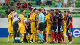 Mindkét együttes óvatosan kezdett, az első negyedóra komolyabb gólhelyzet nélkül, enyhe Vidi-fölényben telt el. A 23. percben aztán csapatunk teljesen váratlanul megfogyatkozott, Huszti csapott össze a becsúszó Bakasetasszal, az olasz játékvezető pedig mindenki legnagyobb meglepetésére egyből a piros lapot mutatta fel játékosunknak. Az eset után feszültté vált a találkozó, tíz perc alatt öt sárga lapot is felmutatott Rocchi sporttárs - hármat mi kaptunk, kettőt a görögök.